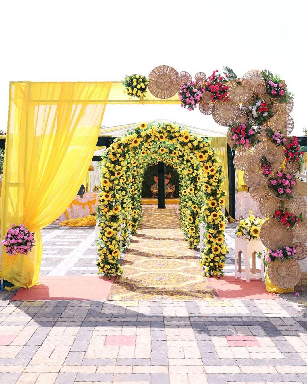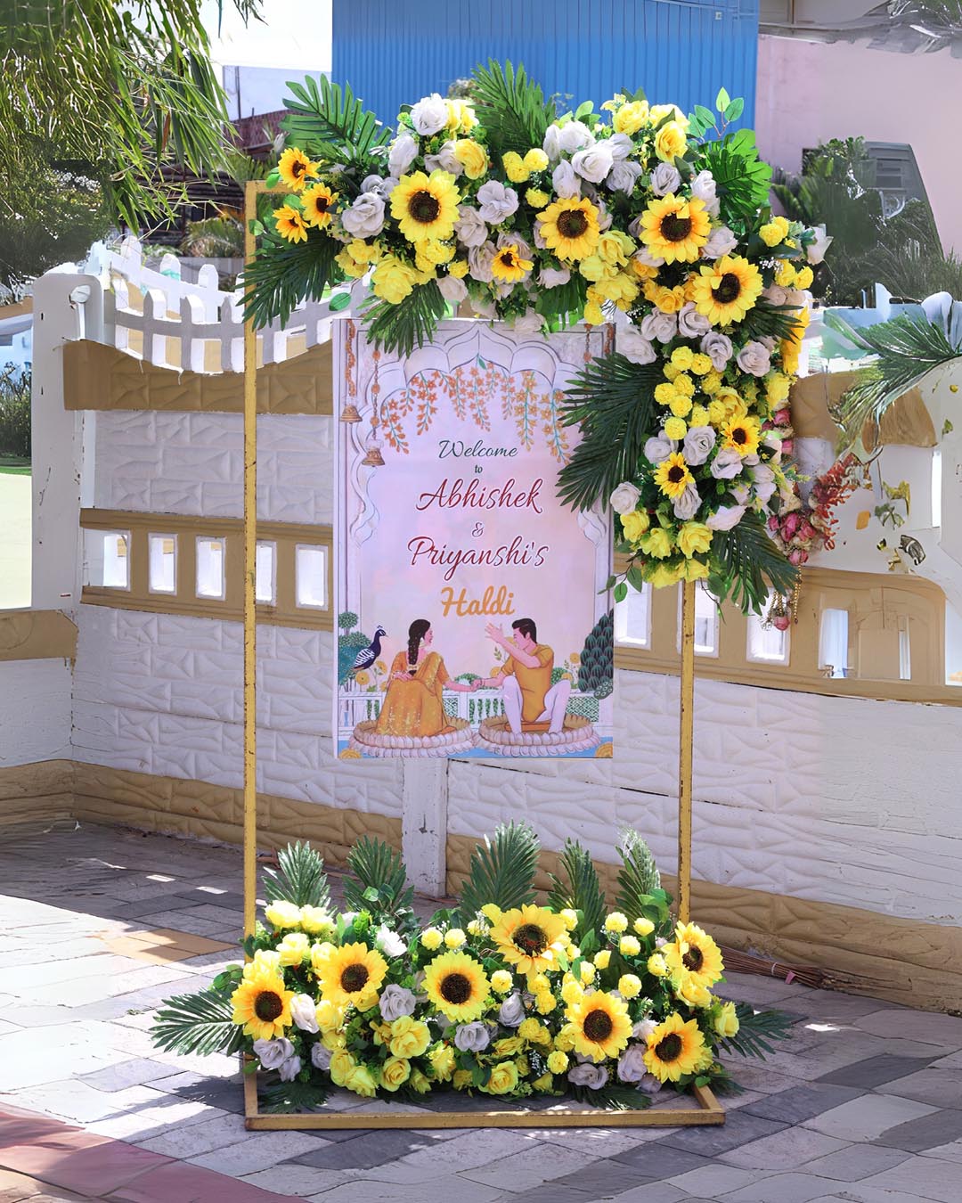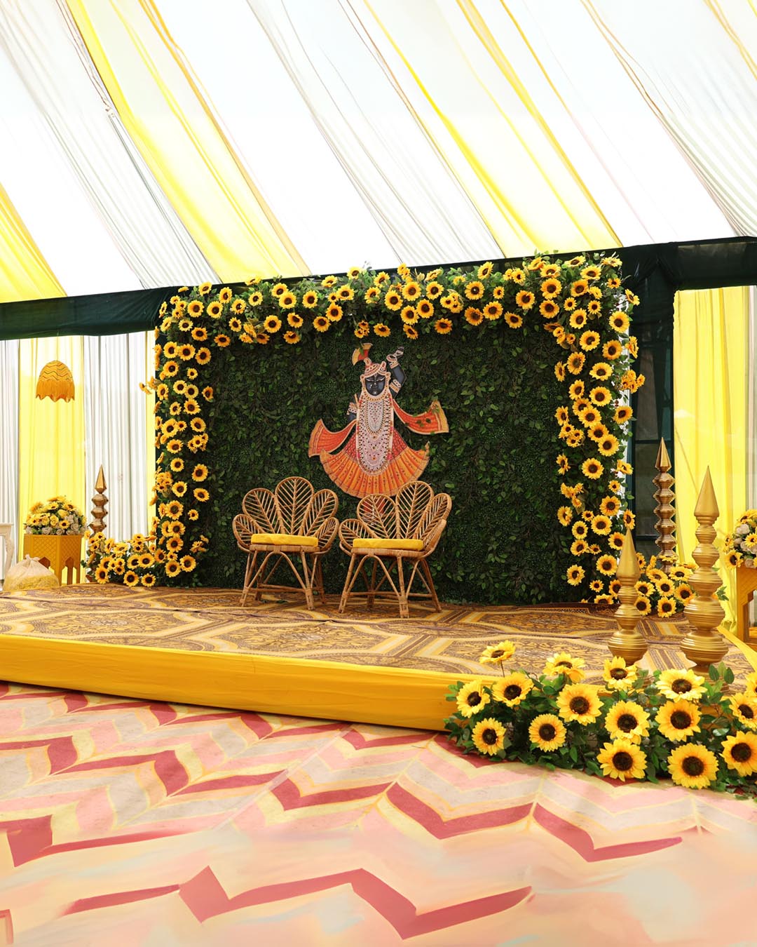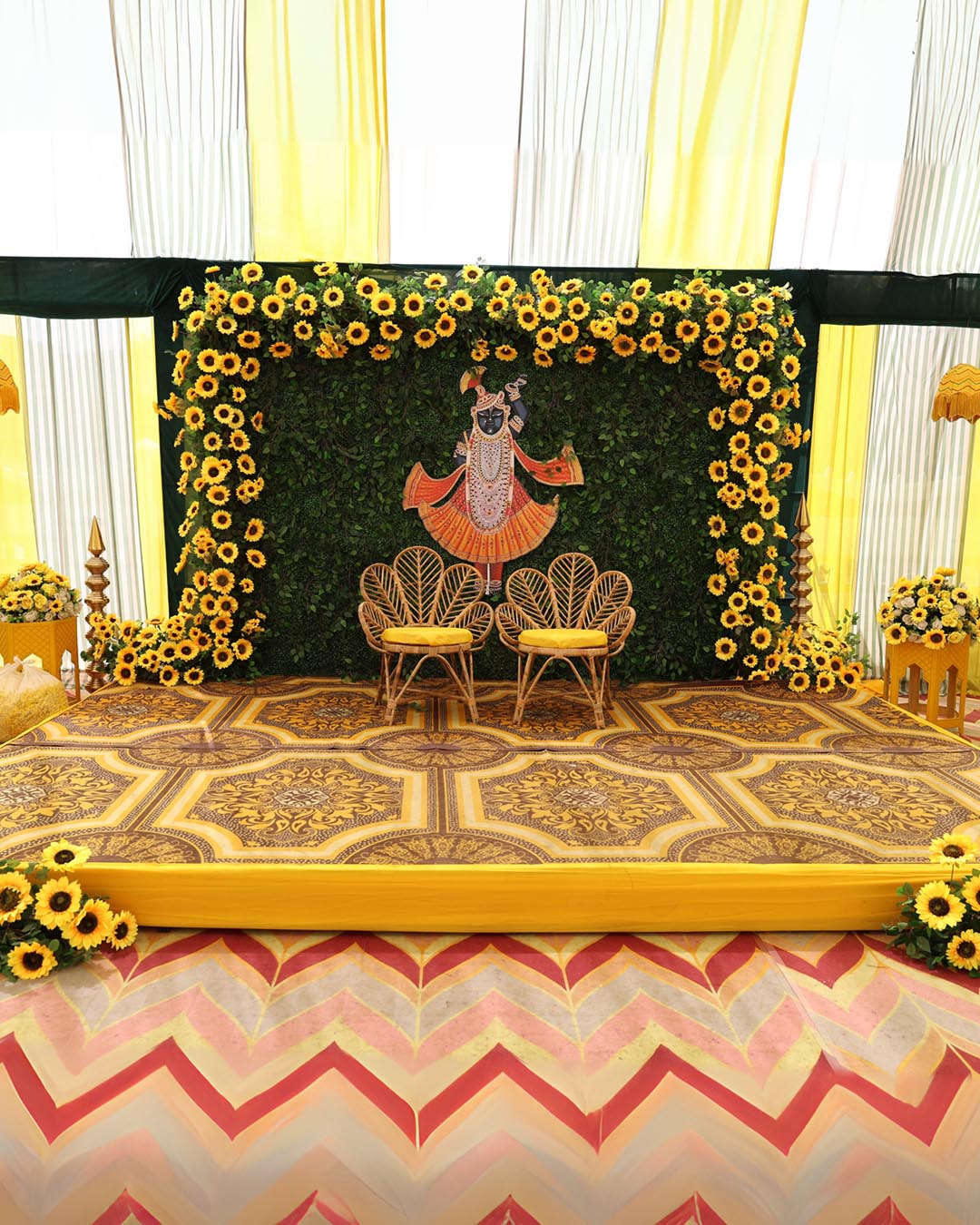 Divine Vibes with Haldi with Shyam — a soulful haldi decor blending traditional yellow tones with divine elements, featuring floral accents and serene setups that celebrate love, joy, and blessings from Lord Shyam.